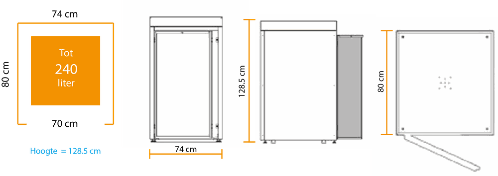 Uw container kan u er makkelijk in en uithalen en iedere kliko heeft een aparte compartiment zodat het volledig afgesloten is. In onze kliko-ombouw past een maximale grote container van 240 liter in. Meet uw container thuis op, de maten van de kliko kunnen verschillen per gemeente.